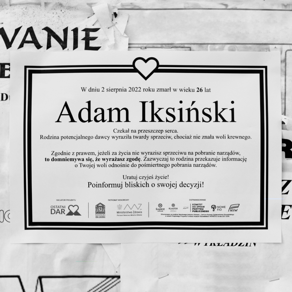 ⚫ „W dniu 2 sierpnia 2022 roku zmarł w wieku 26 lat Adam Iksiński. Czekał na przeszczep serca.” 👈 tak zaczyna się nasz plakat, element kampanii społecznej dot. transplantacji. 😢